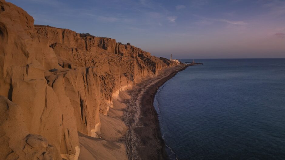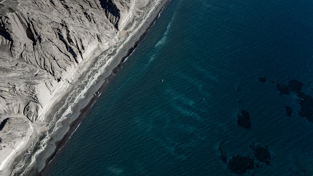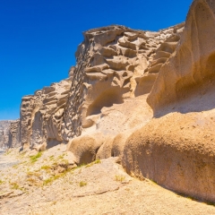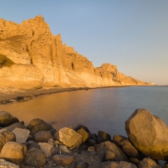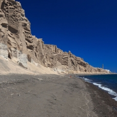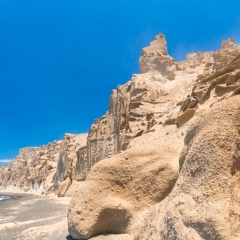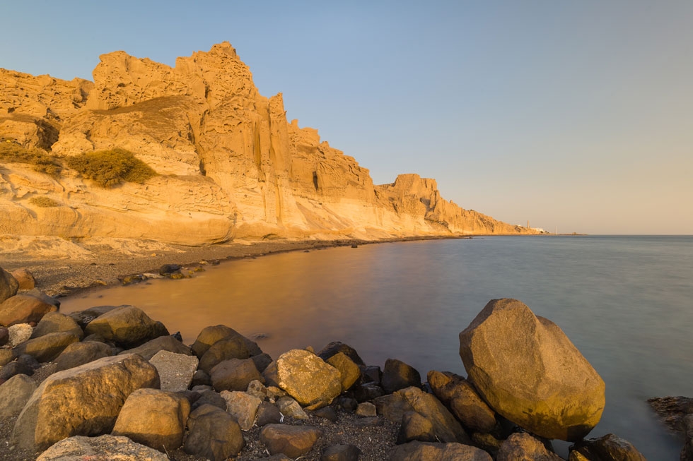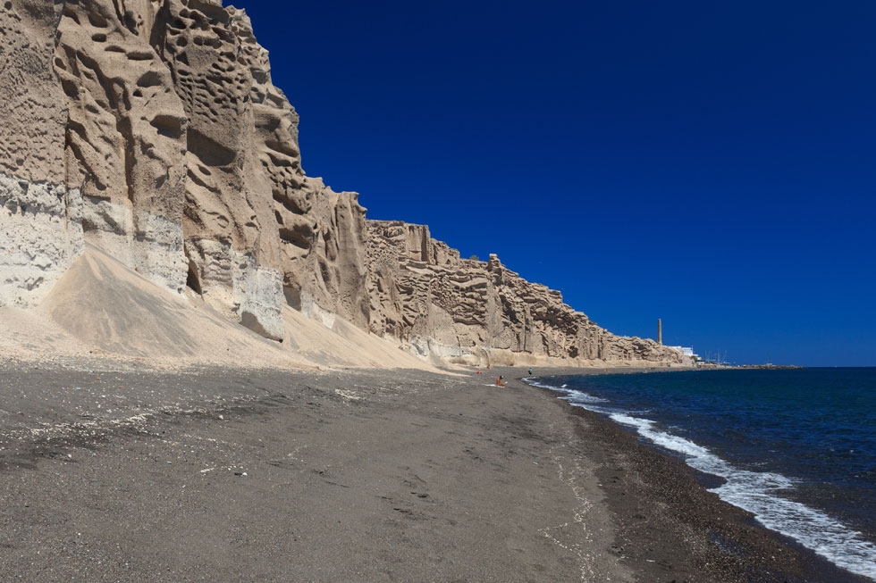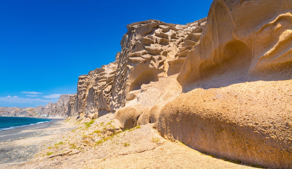 Chiselled by the elements, the cliffs that cling on to Vlychada beach resemble a monumental sculpture. Its undulating, lunar landscape, the handiwork of the wind, sea and the volcano, embraces the long, pebbly beach as if to protect bathers in its enticingly shallow waters from the onslaught of capricious natural forces.