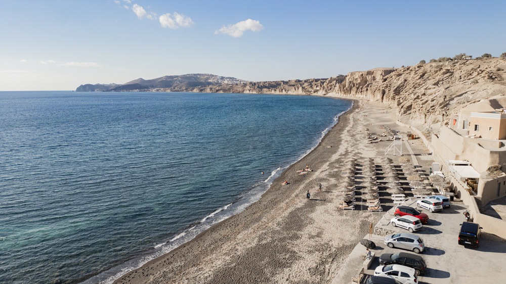 This is by far the most beguiling beach on Santorini with its dark sand offsetting the enticingly shallow waters.